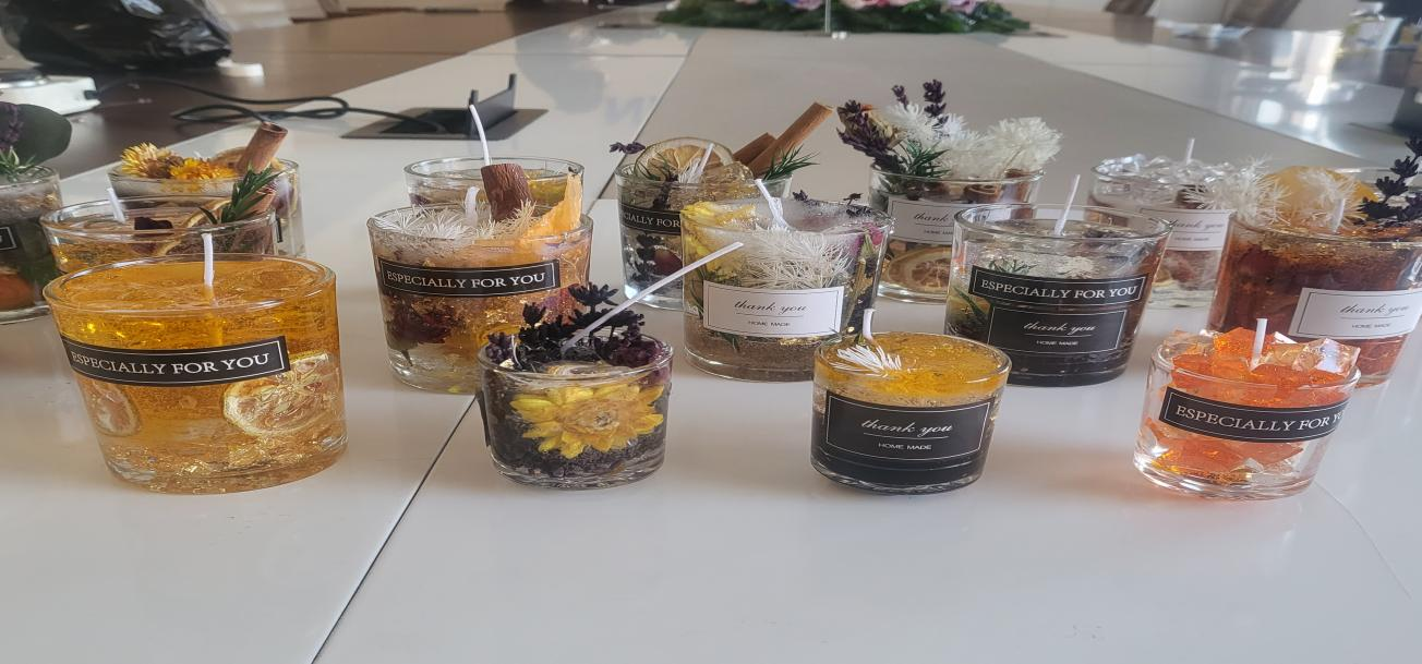 大家充分發(fā)揮創(chuàng)造力,經(jīng)過近一個小時的精心制作,一份份獨(dú)特的、充滿創(chuàng)意的香薰蠟燭完美的展現(xiàn)在我們面前。作品中香薰造型各異,也代表著大家不同的心境與體驗(yàn),鮮亮的橙色、清新的綠色、淡雅的白色,花立于杯中,或安靜或?yàn)⒚?,給人以美的享受。